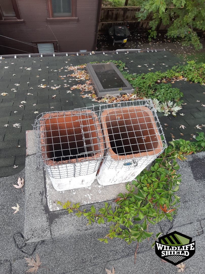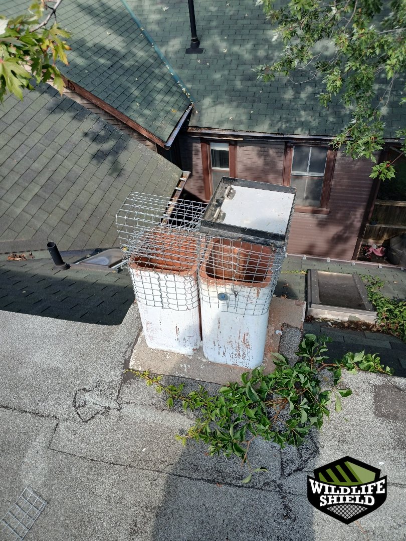 After a period of confirmed inactivity, the one-way device was removed. Chimney openings were permanently sealed with wildlife-resistant screening and covers to prevent future access.