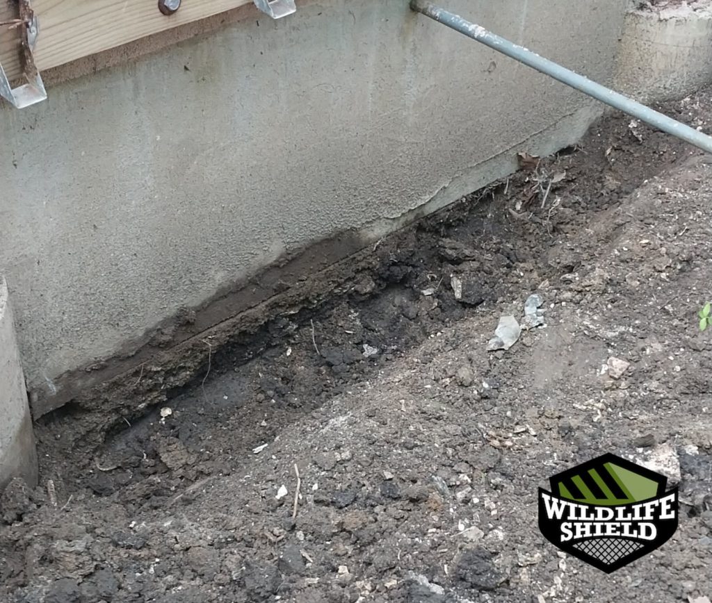 A trench was dug around the full accessible perimeter of the deck. Galvanized steel mesh was mechanically fastened to the structure and buried approximately one foot down and extended outward to prevent future digging. Additional screening was installed where needed along the foundation and vent areas. All work was completed by our team using standard wildlife exclusion practices.