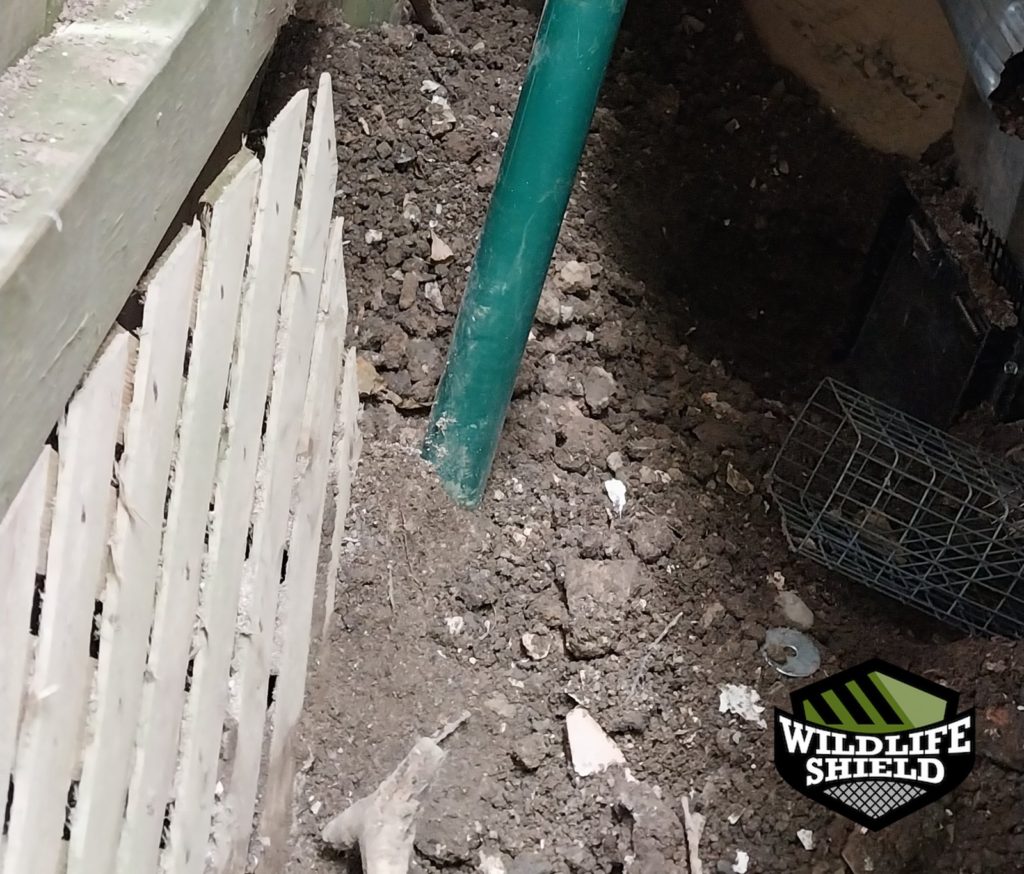During the initial inspection, signs consistent with raccoon activity were observed beneath the deck. These included disturbed soil along the foundation edge and an active burrowing entry point. No evidence of skunk activity was noted.
